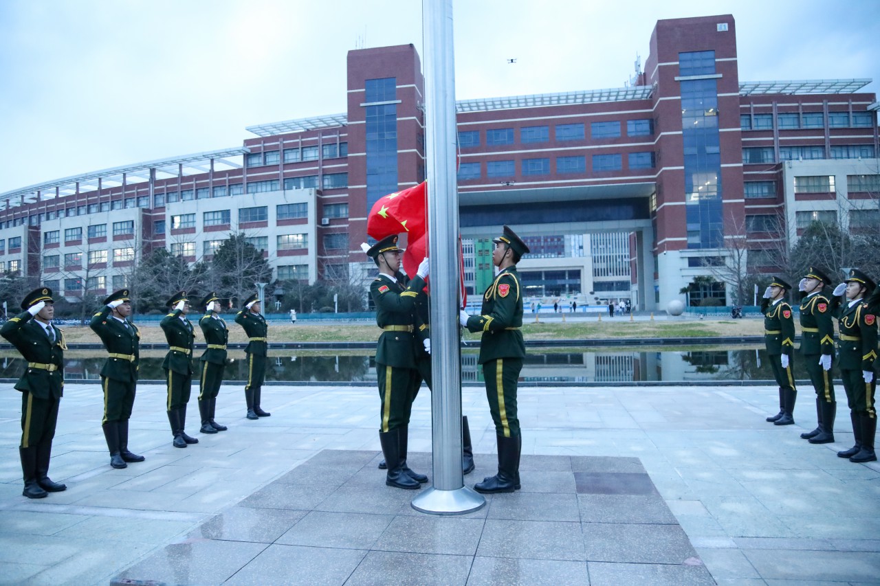 入团仪式前,升旗仪式举行。千名师生行注目礼,共唱国歌。