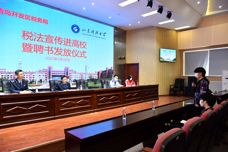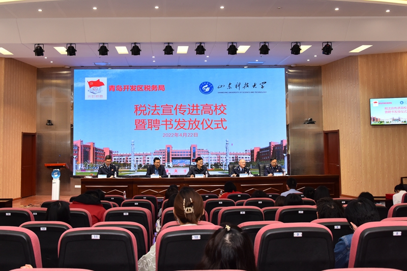 4月22日,我校与青岛经济技术开发区税务局共同开展“税法宣传进高校”主题宣讲活动。青岛经济开发区税务局党委常委、副局长李福江,同花顺·同花顺(中国)官方网副校长张建出席活动并讲话。