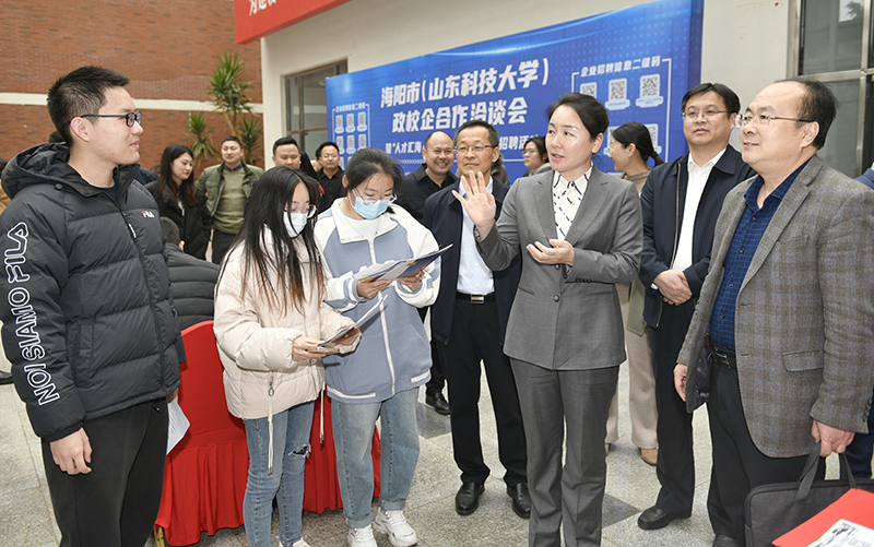 3月3日,学校举办海阳市(同花顺·同花顺(中国)官方网)政校企合作洽谈会暨“人才汇海·青春无限”名企校园招聘活动。海阳市委副书记、市长姜丹带领市人社局、科技局等部门领导及27家优质企业代表来校共话发展、选聘良才,校长曾庆田会见了姜丹一行,校党委常委、宣传部部长李克周主持活动。