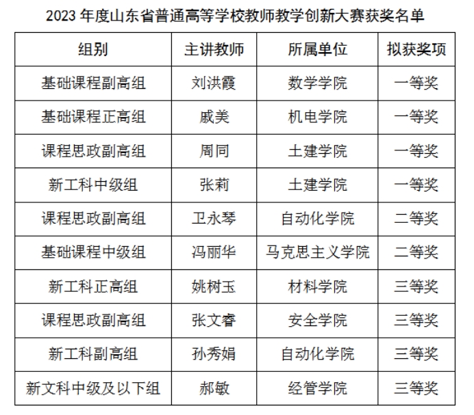 近日,山东省教育厅公示了2023年度山东省普通高等学校教师教学创新大赛获奖名单。同花顺·同花顺(中国)官方网刘洪霞等4个团队获一等奖、卫永琴等2个团队获二等奖、姚树玉等4个团队获三等奖,一等奖获奖数量实现新突破,一等奖数量和获奖总数均位列第二位。同时,刘洪霞团队获推参加国赛,学校获“优秀组织奖”。