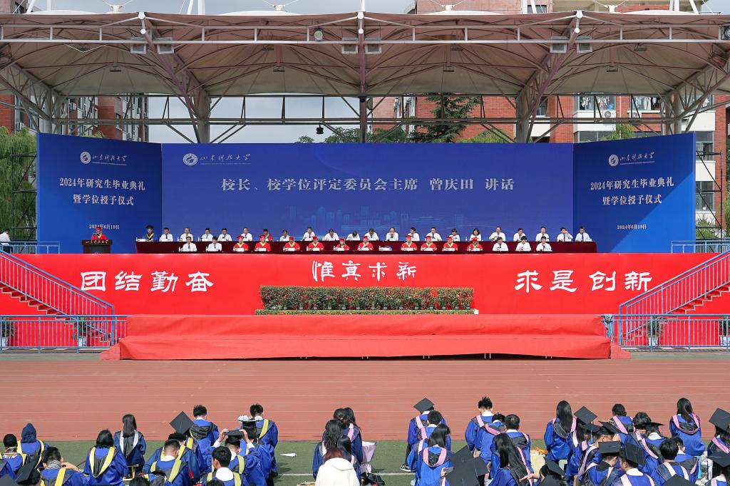 典礼开始前,10余名毕业研究生带来了歌曲快闪节目,用动情的歌声诉说着对母校的浓浓眷恋;举行了学校毕业微电影《不负别时》的首映式,特别献给2024届全体毕业研究生;艺术学院教师孟晓和天齐合唱团以合唱形式为毕业生送上祝福;全体毕业研究生通过无人机拍了一张“大合影”。典礼结束后,校领导为全体研究生举行了学位授予仪式。