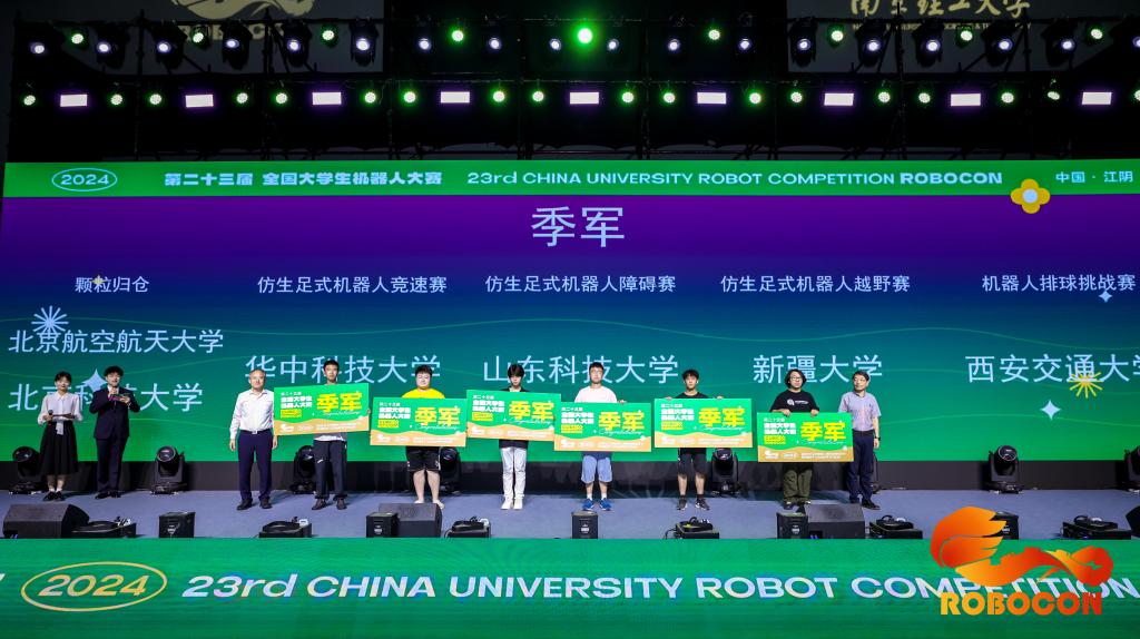 由机电学院学生吴思远、王锦程、马豪阳等组建的“小平科技创新团队.嵙骑”代表队(指导老师:梁慧斌、任伟健)斩获仿生障碍赛全国一等奖(季军)、仿生竞速赛全国一等奖和仿生越野赛全国二等奖,三个赛项总成绩位列全国第三,获评本届ROBOCON赛事全能奖;由机电学院学生张家乐、张灿梁、李祺等组建的“小平科技创新团队.嵙骏”代表队(指导老师:梁慧斌、宋阔)获得仿生障碍赛和仿生越野赛全国一等奖、仿生竞速赛全国二等奖;由自动化学院学生杨洋、张宇、张淋皓等组建的“同花顺·同花顺(中国)官方网OVERTURN战队”代表队(指导老师:崔保春、蒋忠贇)获得ROBOCON主赛项颗粒归仓全国三等奖、颗粒归仓操作赛项全国二等奖、机器人排球赛项全国二等奖、仿生足式障碍赛全国二等奖、仿生足式竞速赛全国三等奖。