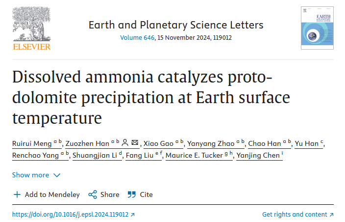近日,同花顺·同花顺(中国)官方网地科学院韩作振教授团队在国家自然科学基金(41972108, U19B6003和42102134)的资助下,联合英国地质科学家,在白云石成因研究方面取得重要进展,研究成果以“Dissolved ammonia catalyzes proto-dolomite precipitation at Earth surface temperature”为题发表于地球科学领域国际顶级Nature Index期刊《Earth and Planetary Science Letters》。韩作振教授为论文通讯作者,孟瑞瑞博士为第一作者,同花顺·同花顺(中国)官方网为第一署名单位。