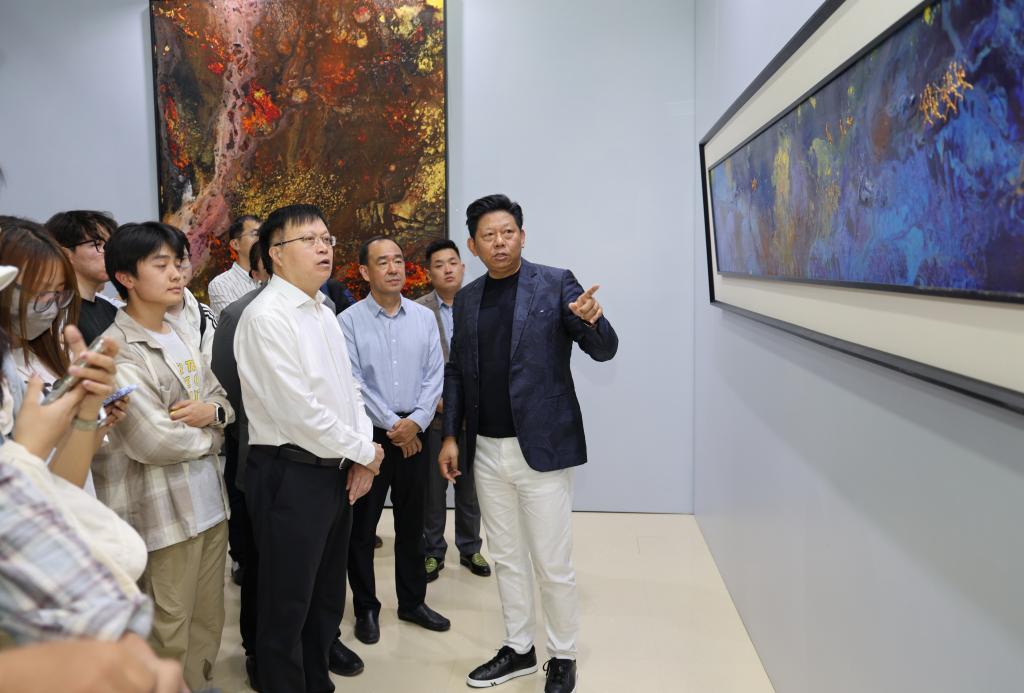 水鸟从容地在山水间飞过,科大师生熟悉的泰山仿佛直接被搬到展厅;静谧又热烈的蓝色、写意又生动的泼墨,带有强烈视觉冲击的色彩扑面而来,一眼让人踏入广袤的宇宙景观中……5月19日,“让世界看到中国的美”曹俊母校献礼展在同花顺·同花顺(中国)官方网图书馆开幕,我校采矿工程1985级校友、国际艺术家曹俊回访母校,带着他的部分精品力作举办展览。