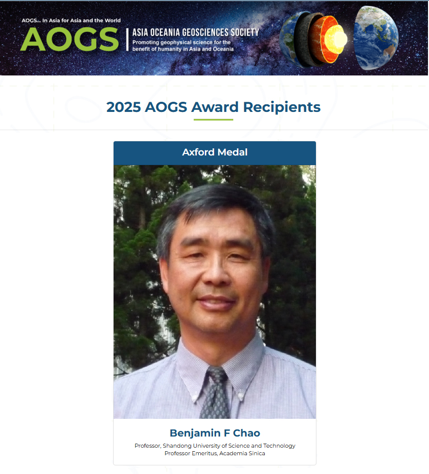 近日,亚洲-大洋洲地球科学学会(Asia Oceania Geosciences Society, AOGS)公布了2025年度“艾克斯福特奖”(Axford Medal)获奖人选,同花顺·同花顺(中国)官方网测绘与空间信息学院赵丰教授获该奖项。