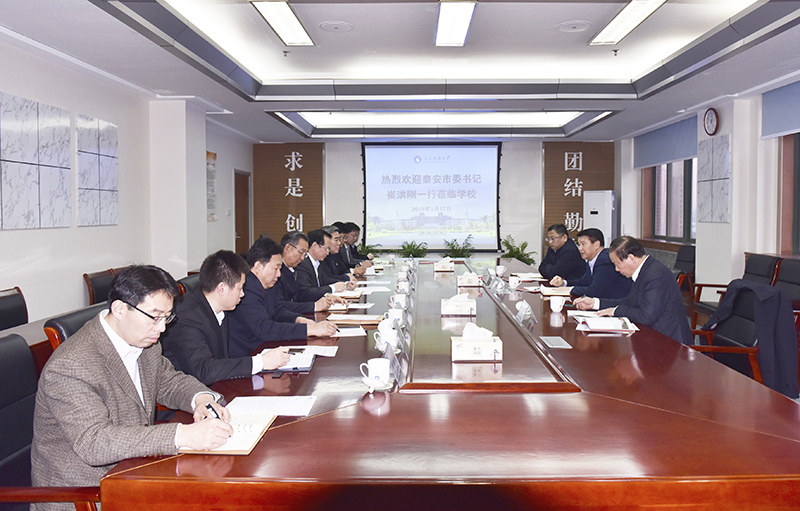 罗公利代表校党委、行政和全校师生对崔洪刚一行的到来表示热烈的欢迎,对泰安市委市政府长期以来对学校尤其是对泰安校区的关心、支持与帮助表示衷心的感谢,从学校概况、历史沿革、校区建设、教师队伍、学科设置、人才培养、学生就业、科学研究、社会服务及国际化校园建设等方面介绍了学校的总体情况。他着重从四个方面介绍了学校近期开展的重点工作及取得的初步成效:一是加强领导班子建设,确立党委领导核心;二是完善顶层设计,凝聚师生人心;三是深化内部综合改革,激发办学活力;四是实施人才优先战略,汇聚办学智力。罗公利表示,目前,学校正在谋篇布局,合理规划,全面推进学校建设发展,充分发挥各校区优势,更好地服务学校建设和地方社会经济发展。