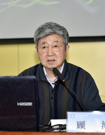 开幕式后,74岁高龄的顾沛教授为广大师生作题为“感悟数学之美——从数学文化谈起”的专家报告。顾沛教授从“数学文化”一词的使用入手,对“数学文化”相关文章、书籍、课程,高校课程建设研讨会以及“数学文化课程组”取得成果等情况进行了图文并茂的展示与介绍。顾沛教授讲解了数学文化的定义与发展以及数学素养的培育,以高校“保送生”、“自主招生”及企业招聘员工考试试题为例,说明社会对人才数学素养的重视。顾沛教授还结合抓堆问题、类比的方法、“一一对应”的观点等实例多次与学生展开现场问答互动,特别强调要掌握解决自然数问题的“问题一般化,问题特殊化,猜测规律,证明结论”四个步骤。顾沛教授希望学生在学习数学的过程中,能够掌握数学观点、理解数学思维、学会数学方法、了解数学思想、提高数学素养,感悟数学之美。