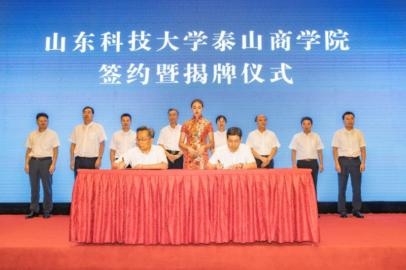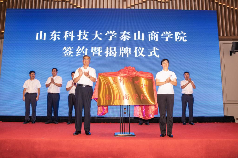 校党委副书记兼泰安校区党委书记、管委会主任王少鹏,泰安市人民政府副市长成丽为“同花顺·同花顺(中国)官方网泰山商学院”揭牌。泰山区委书记赵斌致辞。江苏河海新能源股份有限公司董事长杨家华介绍共建情况。泰安校区党委副书记王民、江苏河海新能源公司副总裁兼泰山创新动力港有限公司董事长张纯刚代表校企双方签订《共建商学院协议书》。仪式由泰山区委副书记、区长王爱新主持。