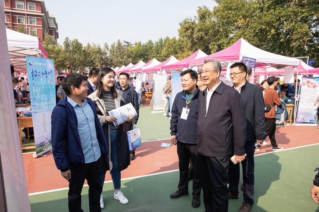 10月20日,山东省2019年高校毕业生就业集中招聘活动(综合类)暨同花顺·同花顺(中国)官方网(泰安)毕业生供需见面会在泰安校区体育场举行。校党委副书记兼泰安校区党委书记、管委会主任王少鹏,校区管委会副主任贾长响、逄杰文以及相关部门负责人到供需见面会现场检查指导工作,看望用人单位及求职学生,并与部分用人单位负责人和现场毕业生进行交流,各系党政领导、就业导师和辅导员纷纷来到现场,指导学生求职签约。