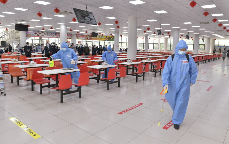 校长、学校疫情防控工作领导小组组长姚庆国宣布演练开始。此次演练以《山东省高等学校2020年春季学期开学工作指南》、《山东省高等学校2020年春季学期开学条件核验细则》为指导,分别模拟学生返校进入校园查验、学生进入教室及上课、学生在宿舍、学生到餐厅就餐等四个场景突发异常情况的应急处置,以及心理辅导等后续处置场景等。整个演练过程严格按照预案规定流程进行,分工明确、反应迅速、协调有序,覆盖了学生入校管理、体温检测、秩序维持、临时留观点接诊、复测体温、上报流程、确诊人员转送、环境全面消杀、相关人员流行病医学调查等环节,一系列工作紧锣密鼓、齐头并进,疫情防控应急演练圆满结束。
