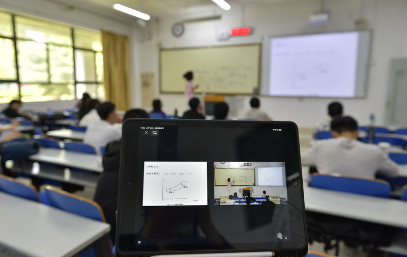 “按照疫情防控要求,学生在教室上课需要保持一米以上的安全间距,为了解决教室容量问题,早在开学之前,学校投入了专项经费,在全省率先安装了教室课堂常态化直播平台,该平台让在教室、宿舍和家中的学生同步上课。”教务处有关负责人介绍。