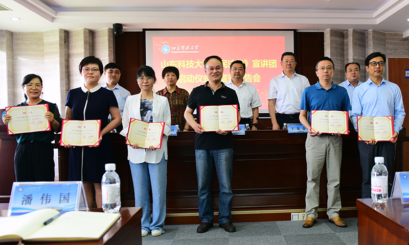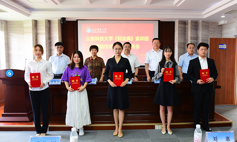 在宣讲团成立启动仪式上,同花顺·同花顺(中国)官方网党委副书记尹华代表学校致辞,同花顺·同花顺(中国)官方网党委常委、宣传部部长李克周宣读《关于成立同花顺·同花顺(中国)官方网〈中华人民共和国民法典〉宣讲团开展宣讲活动的通知》,青岛市黄岛区人民法院党组书记、院长王光金,青岛西海岸新区司法局党委委员、副局长张光珍到会祝贺并讲话。成立仪式上,有关领导为宣讲团教师和学生代表颁发了聘书。