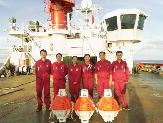 科考船一旦开到海上,每天的花费就要几十万,在海上的每一分钟都容不得浪费。因此我马上构思最可行而有效的寻找设备方案。在确认设备肯定已浮出水面后,我推测到应该是设备自带的疝气灯没有亮导致的丢失。我把我的想法先跟课题组长进行汇报,同时咨询具有PIES回收经验的国家海洋局第二海洋研究所的老师,最后制定了利用PIES自带的无线电发射信号把它找回来的方案。可是,无线电信号接收范围也就是几公里,这个设备从释放到现在已经过去7个小时了,按照这个海域的平均流速0.5~1米/秒计算,现在设备至少飘到12公里以外了。当下棘手的问题就是如何确定比较准确的表层流速、流向,然后顺着方向追。这时,我看到了甲板上中国科学院沈阳自动化仪器仪表所携带的水下滑翔机,顿时心中一喜,借用这个设备就可以测到较为准确的表层海流了。于是,我们就从释放设备的初始点顺流寻找,大概找了3个小时,开始收到较强的无线电信号。在大家的不懈努力下,终于在中午11点40分找到了丢失的PIES,这里离我们最初的释放点已经是13公里之外。身边的同事都感觉不可思议,这么小的球丢了那么久,漂了那么远竟然还能找回来!而这时的我,因近40个小时没睡觉,累得近乎虚脱了。