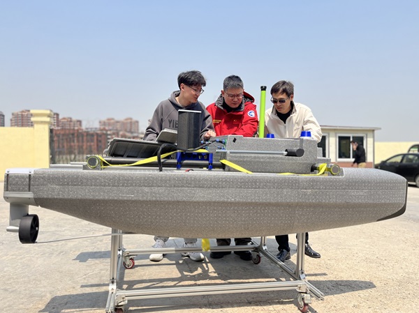 杨继超(中)与学生对无人船进行测试