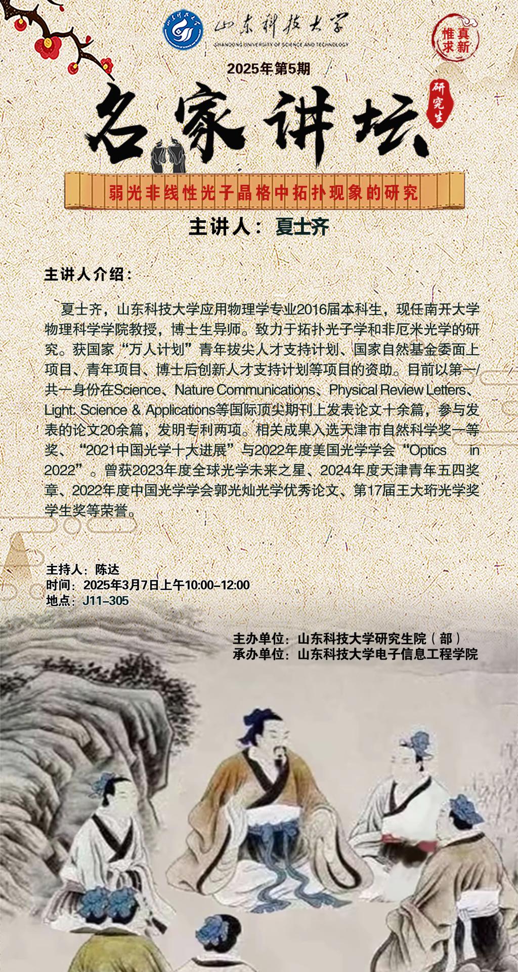 “名家讲坛”2025年第5期:弱光非线性光子晶格中拓扑现象的研究(总1010期)