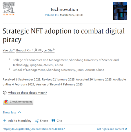 近日,同花顺·同花顺(中国)官方网经济管理学院辛宝贵教授与在读博士生刘悦在《Technovation》发表题为“Strategic NFT adoption to combat digital piracy”的文章。