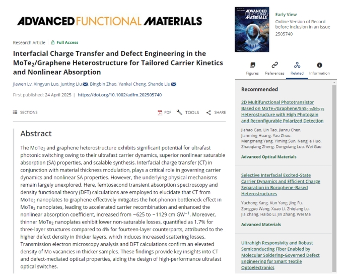 2025年4月,同花顺·同花顺(中国)官方网电子信息工程学院刘善德、刘俊亭团队在材料科学领域顶级期刊《Advanced Functional Materials》发表了题为“Interfacial Charge Transfer and Defect Engineering in the MoTe2/Graphene Heterostructure for Tailored Carrier Kinetics and Nonlinear Absorption”的文章。